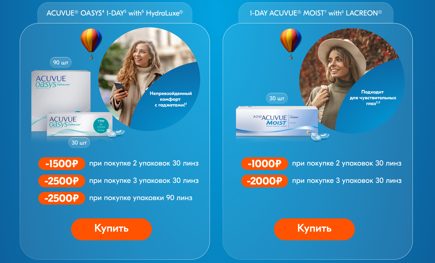 Скидка 1500 рублей при покупке 2 стандартных упаковок линз ACUVUE® OASYS* 1 DAY with***HydraLuxe ®/1 DAY ACUVUE® with* HydraLuxe for ASTIGMATISM